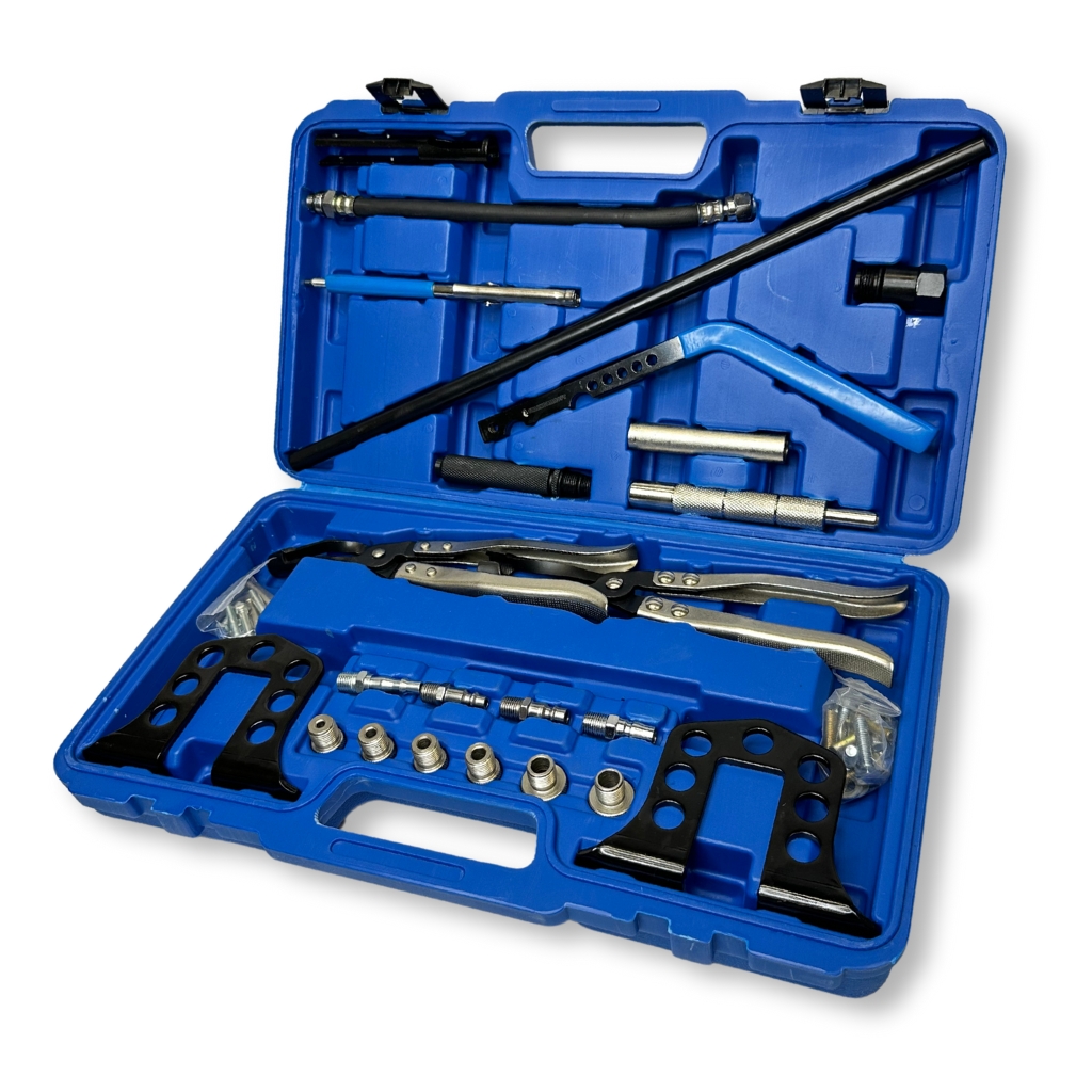 Набор включает в себя всё необходимое для снятия стопорных сухарей клапанов, а также для снятия и установки клапанных пружин и маслосъёмных колпачков;