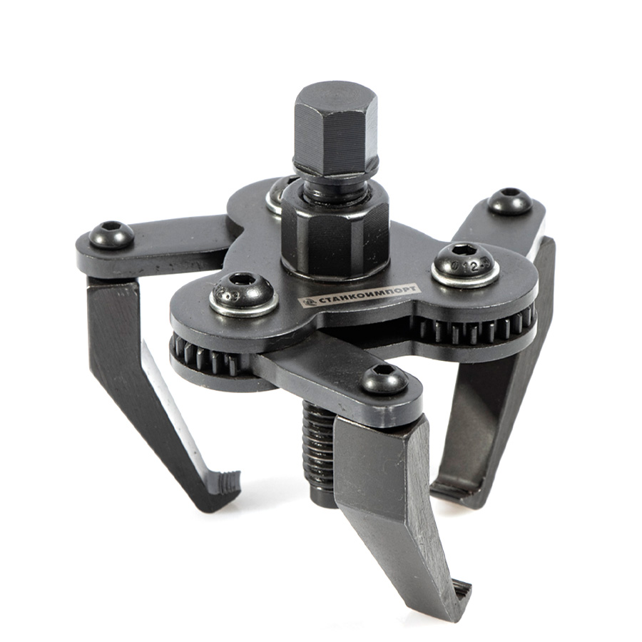 Благодаря своей конструкции, за счет поворотных захватов, обеспечивается легкий и быстрый подгон съёмника на детали, а так же надежное его удержание в процессе демонтажа. Съемник изготовлен из высококачественной хромованадиевой стали что позволяет развивать усилие в 1,5 тоны.