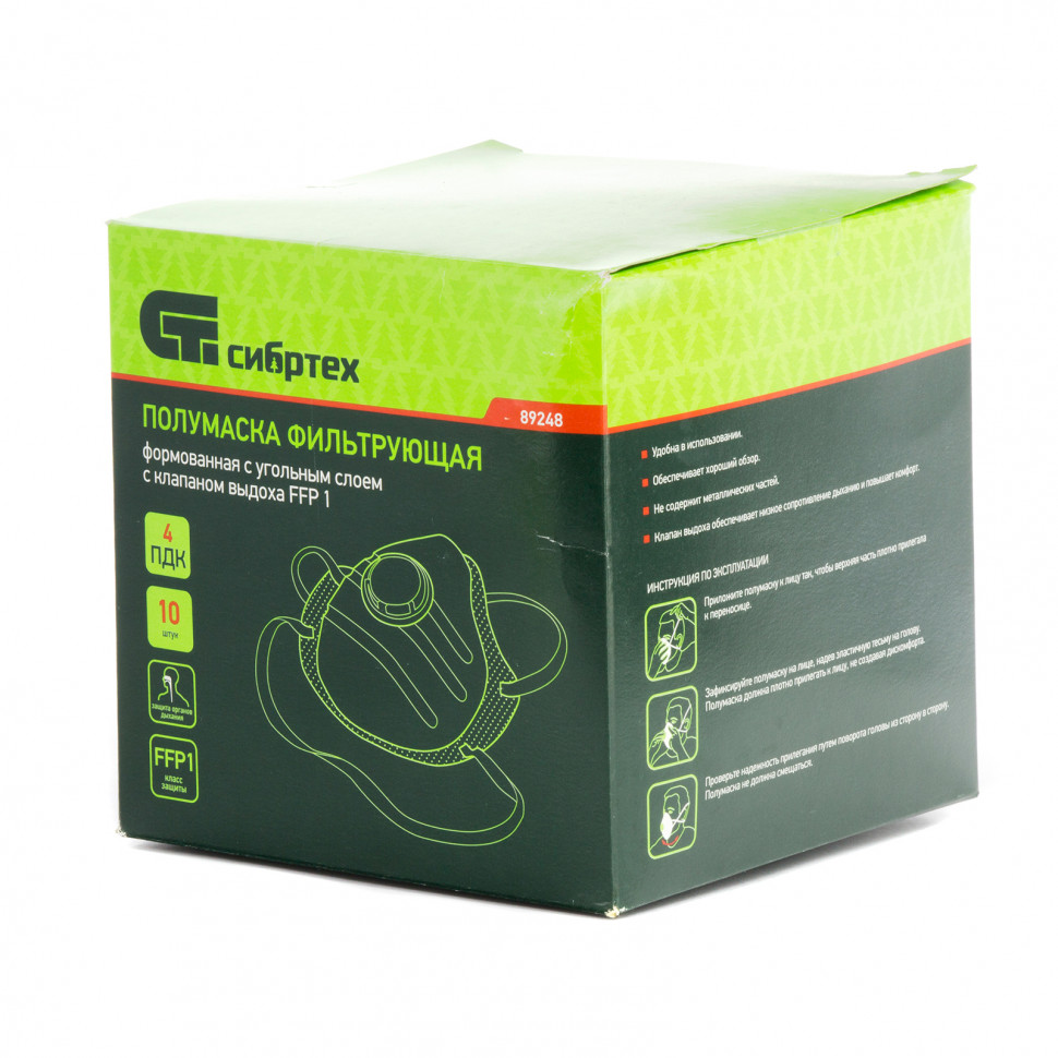 Фильтрующая полумаска (респиратор) Сибртех 89248, FFP1, c угольным слоем и клапаном выдоха, относится к категории средств индивидуальной защиты (СИЗ). Служит для защиты органов дыхания человека от различных видов аэрозолей (пыли, туманов и дымов) животного, металлургического и минерального происхождения, дустов и порошкообразных удобрений, не выделяющих токсичные газы и пары. Она предотвращает попадание вредных веществ из воздуха в органы дыхания. Изделие пригодится мастерам, работающим на пищевых, деревообрабатывающих и иных предприятиях, где могут содержаться частицы пыли, угля, мела и т.д. Подходит только для одноразового использования.ПреимуществаТекстурированный полипропилен, из которого изготовлена полумаска, хорошо пропускает воздух, поэтому в ней легко дышать.Полумаска оснащена клапаном выдоха, поэтому излишнее тепло отводится, а влага не скапливается.Угольный слой способен на несколько часов задержать опасные вещества и снизить дискомфорт при возникновении неприятных запахов, превышающих предел допустимой концентрации (ПДК) до 4 раз.Полоса обтюрации отличается широкими кромками, поэтому полумаска комфортна в использовании.Надежность фиксации на лице любого типа достигается за счет чашеобразной формы и эластичной резинки.Полумаска долго сохраняет свою форму, т.к. отличается устойчивостью к смятию.Сертификат соответствия ТР ТС 019/2011 «О безопасности средств индивидуальной защиты» выступает залогом качества маски.В качестве упаковки используется удобный цветной полипропиленовый пакет с еврослотом.