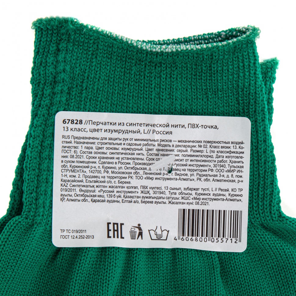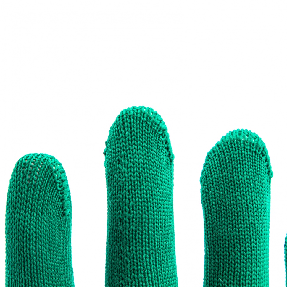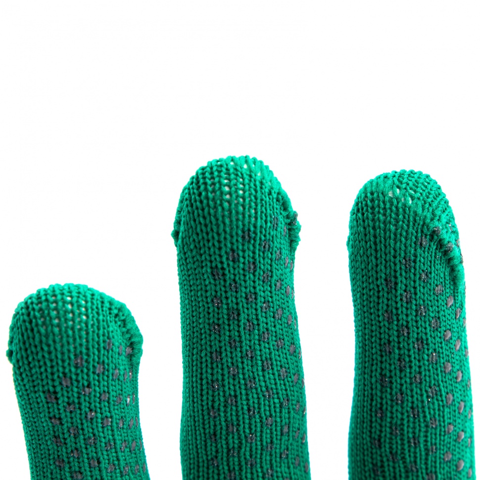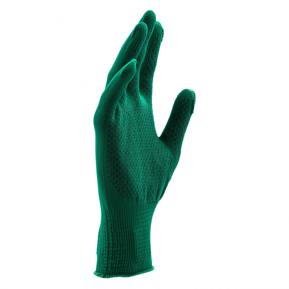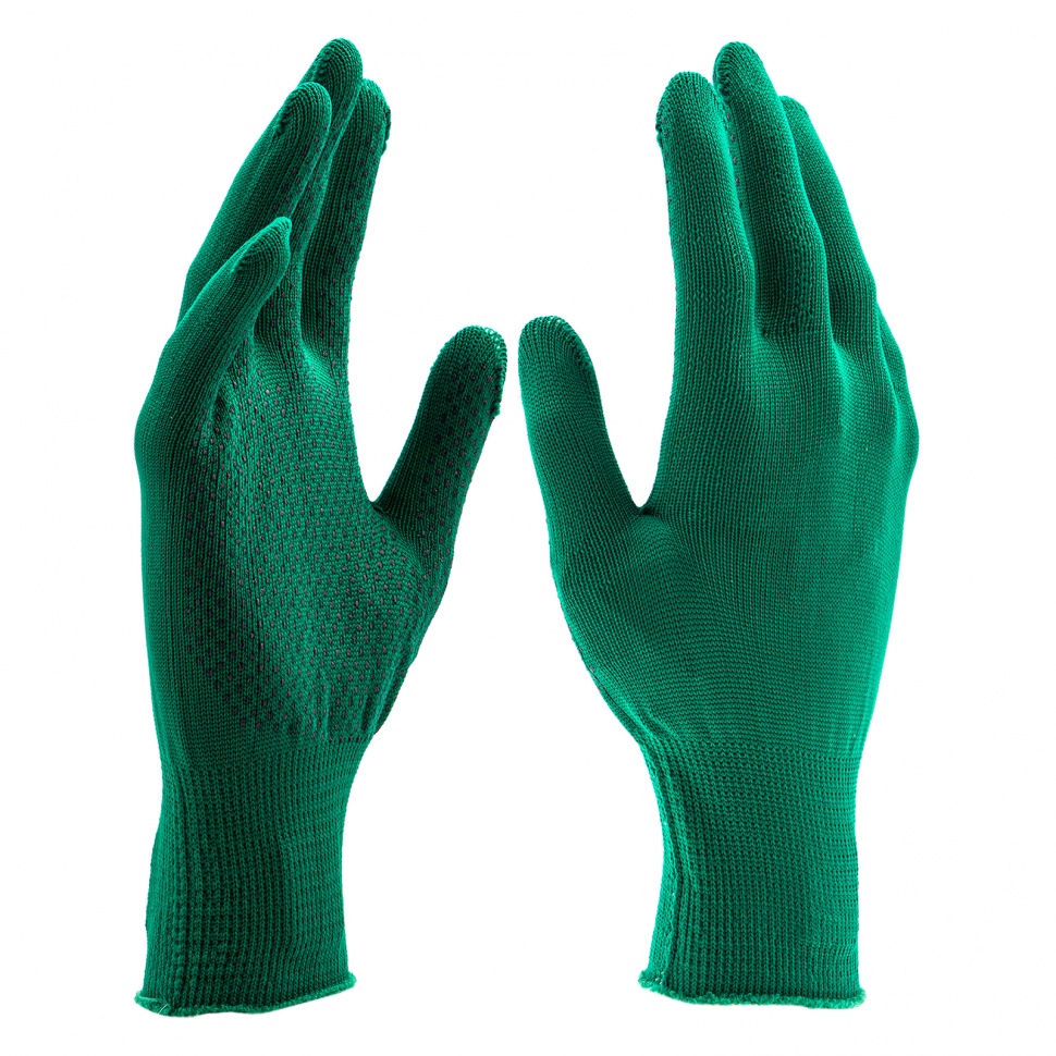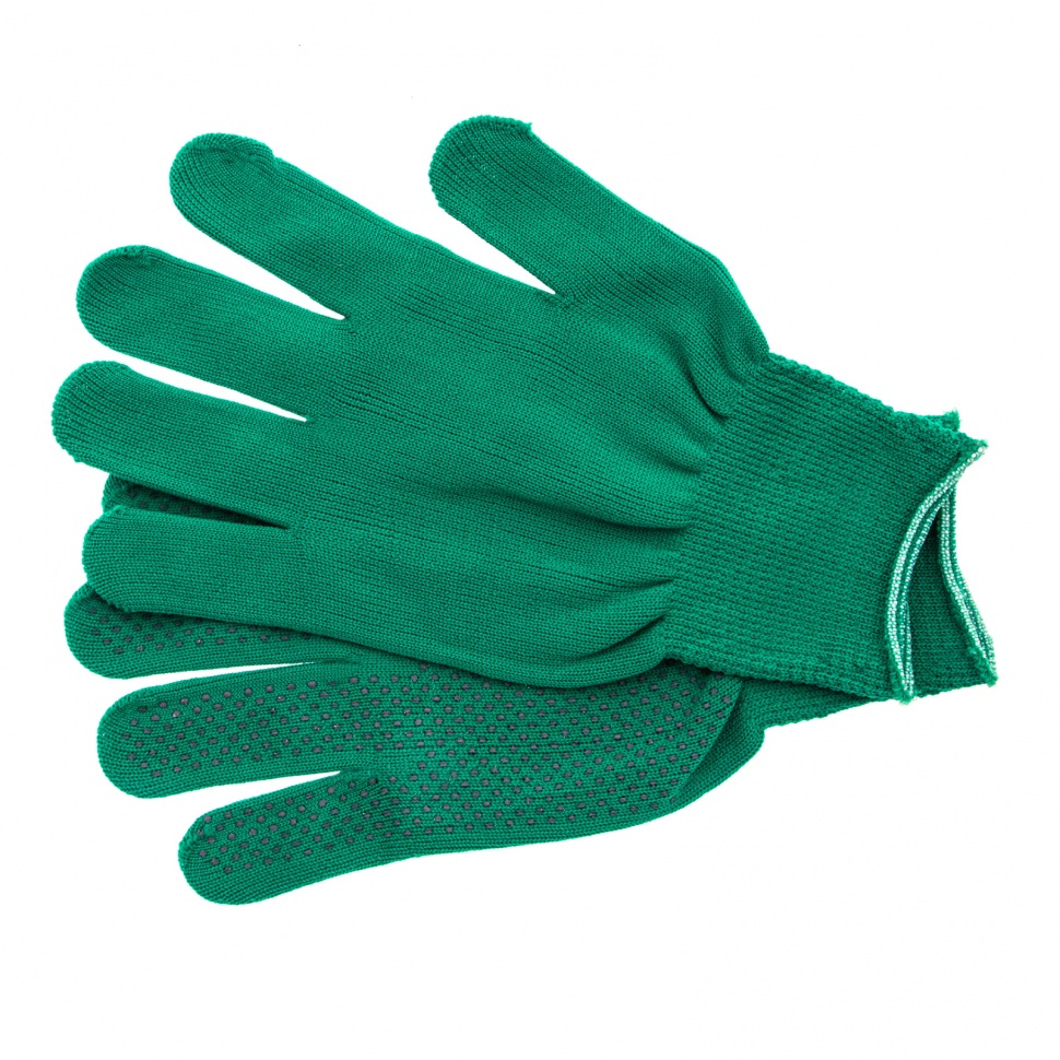 Перчатки из синтетической нити 67828 с ПВХ точкой, изумрудного цвета, 13 класс вязки, размера L, применяются для защиты рук от царапин и ссадин. Они станут незаменимым помощником при осуществлении строительных, ремонтных, садовых и других работ. Плотная ткань из тонких синтетических нитей сохраняет высокую чувствительность пальцев, что особенно актуально при проведении точных работ.ПреимуществаНейлоновые нити — перчатки гипоаллергенны, обладают высокой устойчивостью к истиранию и пропускают воздух, поэтому в них удобно работать.Эластичные манжеты — перчатки надежно фиксируются на запястье и не спадают.Точечное ПВХ-покрытие — инструменты не будут выскальзывать из рук.