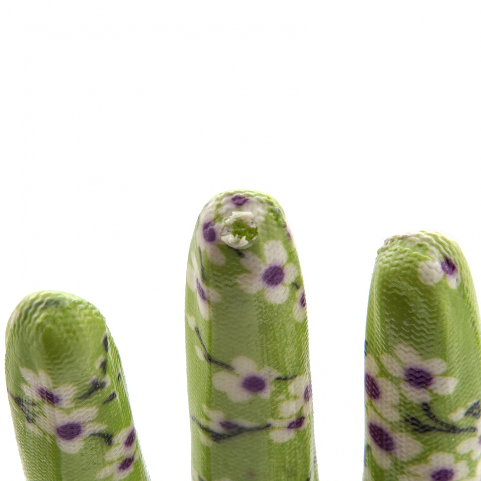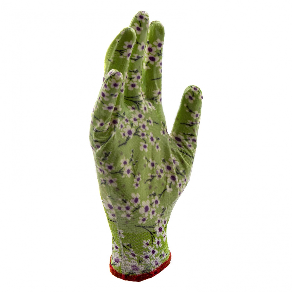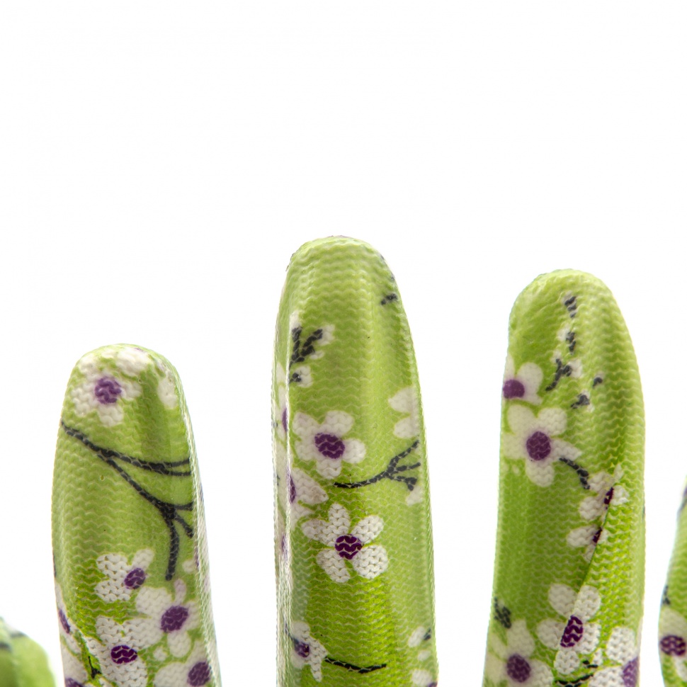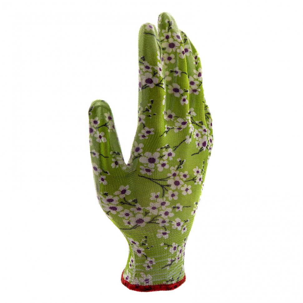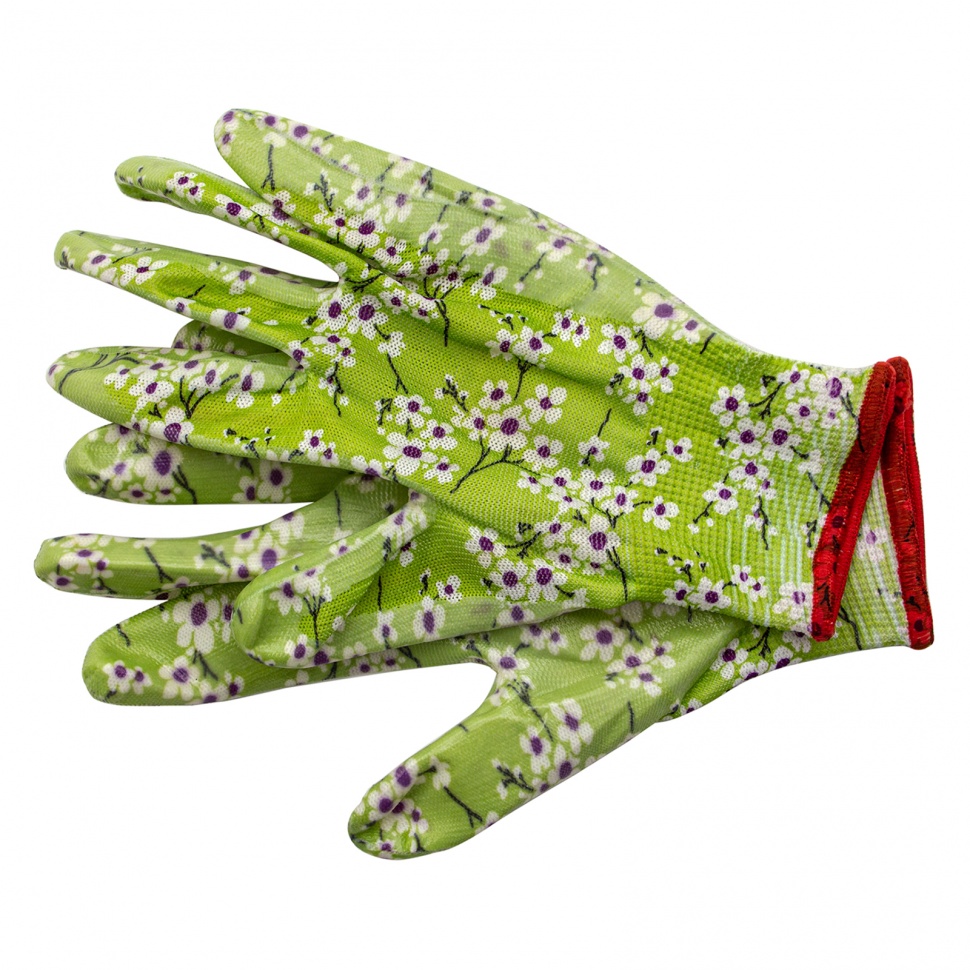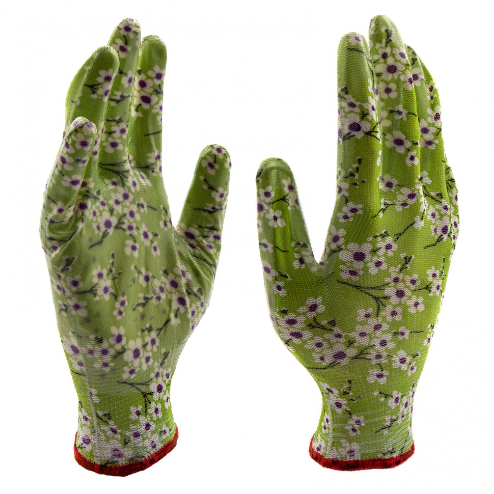 Перчатки защищают руки от порезов, проколов, царапин, ссадин и намокания во время садово-огородных работ.ОсобенностиМатериал перчаток из полиэстера устойчив к истиранию и воздействию ультрафиолета.Нитрильное покрытие обеспечивает надежное сцепление с рабочей поверхностью, благодаря чему садовый инструмент не выскальзывает из рук.Эластичные манжеты плотно облегают запястья, поэтому перчатки не сползают с рук.Ткань обеспечивает хороший воздухообмен и тактильную чувствительность пальцев, повышая комфорт во время работы.Края манжет обработаны на оверлоке, предотвращая их распускание.ПреимуществаМатериал основы не вызывает аллергии, поэтому использование перчаток безопасно для здоровья.
