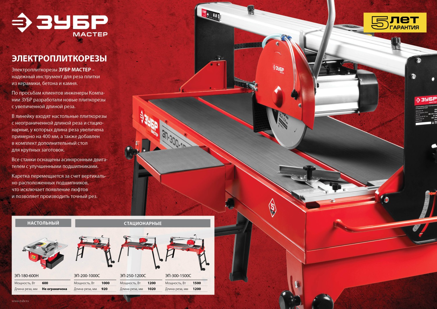 Компактный настольный плиткорез для любых видов (прямой, косой, под углом, комбинированной) резки плитки. Идеально подходит для работ с напольной и настенной плиткой. Функция влажной резки повышает срок службы расходного инструмента, а также уменьшает количество вредной пыли при работе. Продольная направляющая гарантирует точность пиления в размер. Безопасность оператора обеспечивается защитным кожухом и электромагнитным выключателем